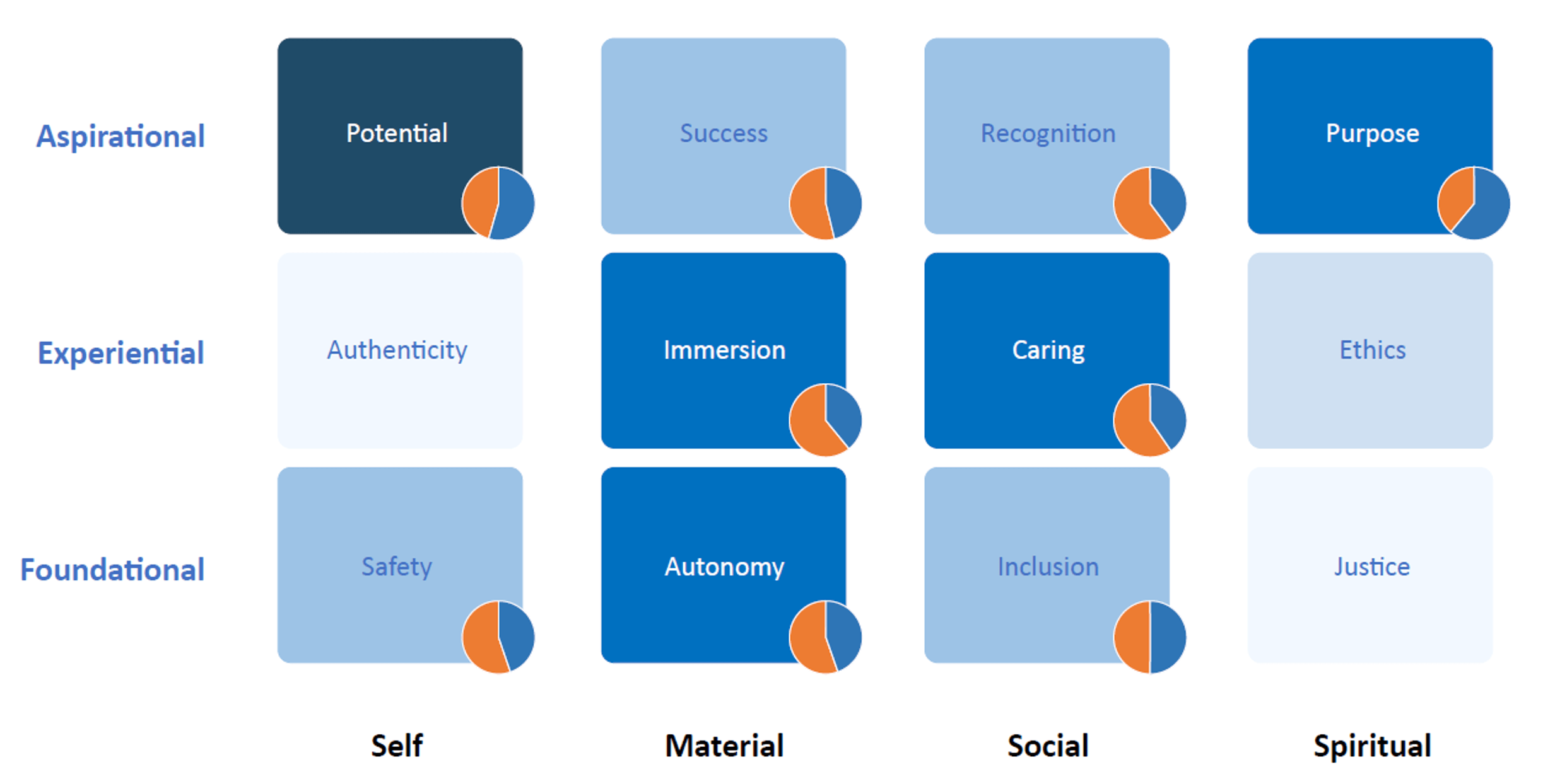 - Authenticity (0.29 vs. 0.19) → Unlike other cells, authenticity shows a smaller difference. This suggests that while emotional stress heightens other needs, it does not dramatically impact the drive for self-expression.